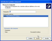 Windows XP può cercare la stampante sulla rete autonomamente o connettersi direttamente (sarà però necessario specificare il percorso di rete). Una volta trovata la stampante basterà selezionarla per installarla sul computer client. Al termine della procedura, si potrà stampare una pagina di prova per verificarne il corretto funzionamento.