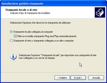 Nella finestra che compare scegliamo Aggiungi stampante per avviare l’installazione guidata e facciamo clic su Avanti. Selezioniamo l’opzione che descrive la stampante; in questo caso Stampante locale collegata al computer e facciamo ancora clic su Avanti. Il computer riconosce la stampante plug&play.