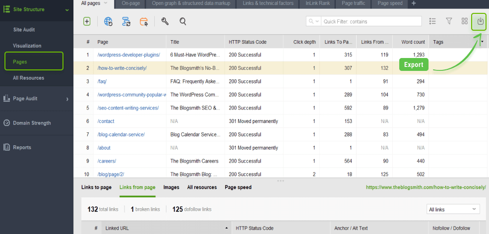 En appuyant sur la flèche vers le bas dans le coin supérieur droit de votre espace de travail dans WebSite Auditor, vous pouvez exporter toutes les URL au format CSV. Cela facilitera la gestion de toutes les URL, la consolidation des données pertinentes et la priorisation des tâches d’élagage.